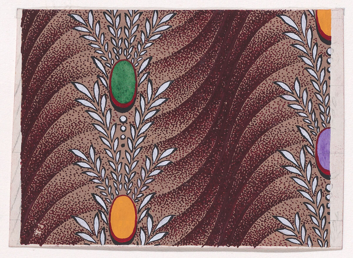 Rectangular sheet of paper with a textile design from a group, dated 1840, made in Mulhouse, Alsace, which was an important nineteenth-century center for textile production in the Haut-Rhin region of France. The design is made up of vertical garlands of stylized leaves and pearls with ovals over a strip of overlapping scales of light tan color with dark reddish-brown stipples. The leaves and pearls are colored with white; the ovals are colored alternatingly with green, orange, and purple, and outlined with red.