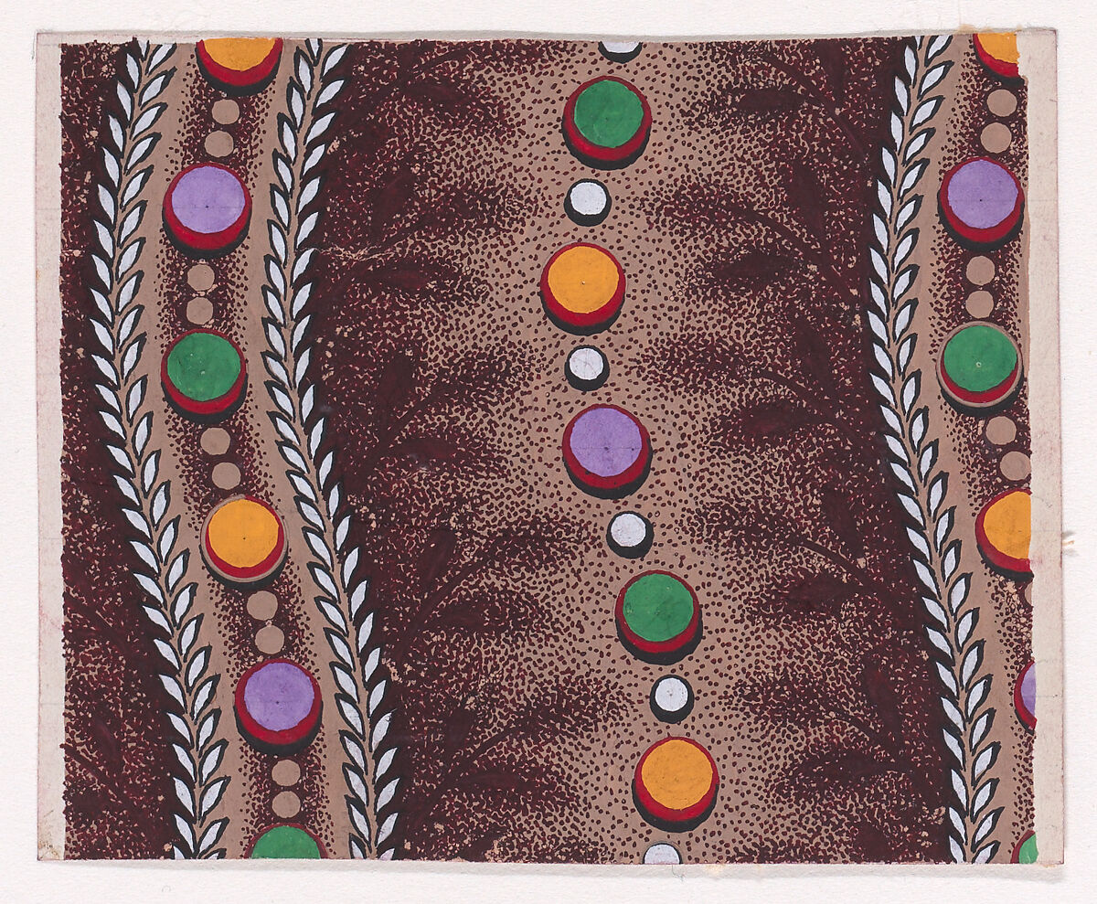 Rectangular sheet of paper with a textile design from a group, dated 1840, made in Mulhouse, Alsace, which was an important nineteenth-century center for textile production in the Haut-Rhin region of France. The design is made up of vertical undulating ribbons of light tan color framed by garlands of stylized leaves and with a strip of stipples of dark reddish-brown color with pearls and dots running along the center of the ribbon, and with offsetting branches with stylized leaves rendered with stipples of dark reddish-brown color, separated by undulating strips of alternating pearls of the size of those in the garlands and smaller ones. The larger pearls are colored alternatingly with orange, purple, and green, and outlined with red; the smaller pearls are colored with white. The leaves framing the ribbon are of white color, and the dots running through the middle are of light tan color. The background is of light tan color with stipples of dark reddish-brown color.