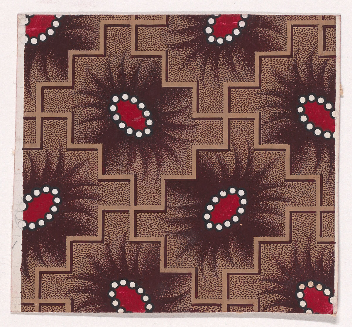 Rectangular sheet of paper with a textile design from a group, dated 1840, made in Mulhouse, Alsace, which was an important nineteenth-century center for textile production in the Haut-Rhin region of France. The design is made up of alternating shuttle-shaped motifs framed by pearls and with offsetting palmettes rendered with stipples of dark reddish-brown color framed by a checked pattern of intersecting zig-zagging diagonal lines of light tan color over a light tan ground with stipples of dark reddish-brown color. The shuttle-shaped motifs are colored with red; the pearls are colored with white.