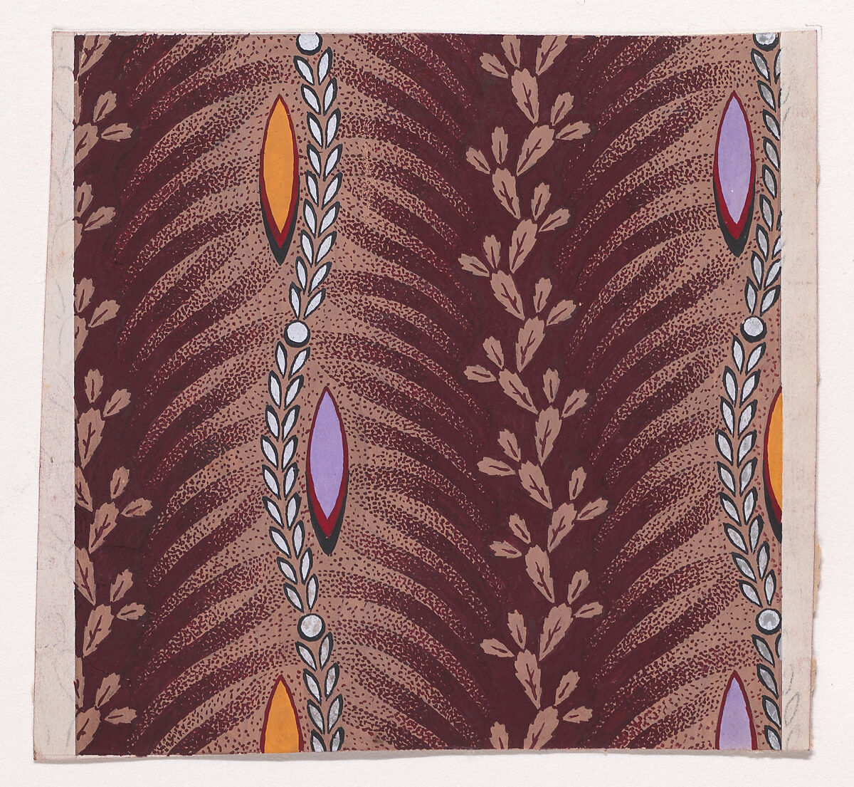 Rectangular sheet of paper with a textile design from a group, dated 1840, made in Mulhouse, Alsace, which was an important nineteenth-century center for textile production in the Haut-Rhin region of France. The design is made up of vertical undulating garlands of stylized leaves of light tan color with offsetting stylized palm leaves of dark reddish-brown color separated by vertical undulating garlands of leaves and pearls with alternating shuttle-shaped motifs over a light tan ground with stipples of dark reddish-brown color. The leaves and pearls are colored with white; the shuttles are colored alternatingly with orange and purple.
