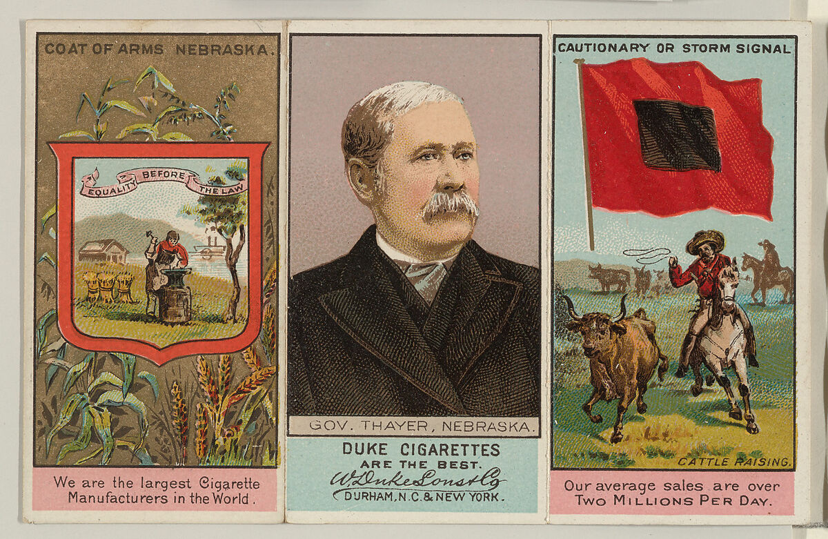 Governor Thayer, Nebraska, from "Governors, Arms, Etc." series (N133-2), issued by Duke Sons & Co.