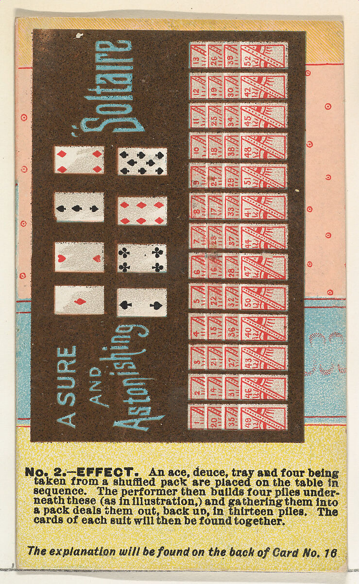 Number 2, A Sure and Astonishing Soltaire, from the Tricks with Cards series (N138) issued by W. Duke, Sons & Co. to promote Honest Long Cut Tobacco