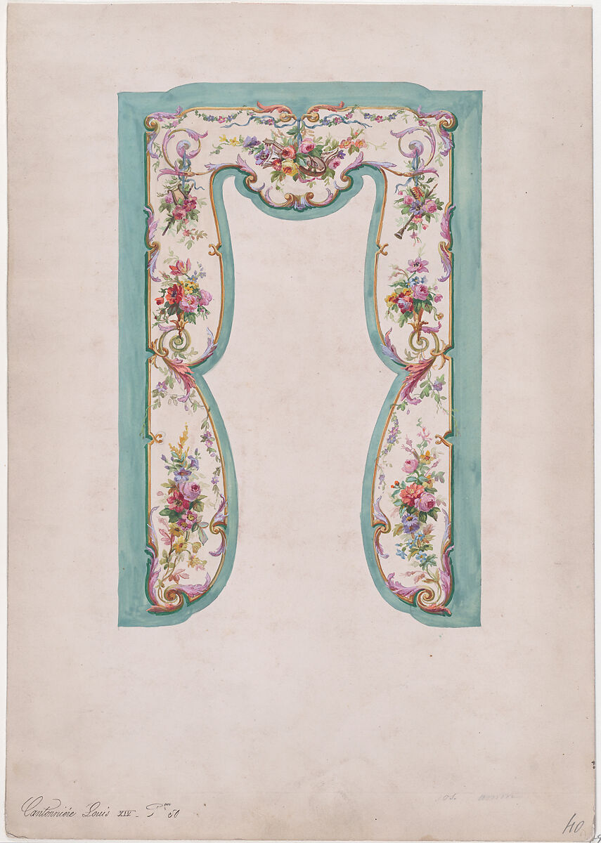 The design contains an inscription in ink in the recto of the sheet of paper, which relates it to the style of Louis XIV, although the style seems to be closer to that of its successors, Louis XV and Louis XVI.