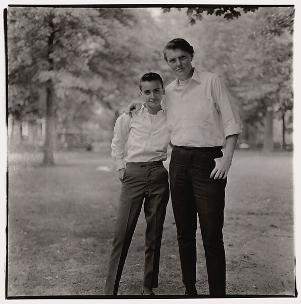 This photograph is part of a series of portraits Arbus made in Washington Square Park during the summer of 1965. She later remarked that the park’s inhabitants included rival but permeable factions: "There were young hippie junkies down one row. There were lesbians down another, really tough amazingly hard-core lesbians. And in the middle were winos. They were like the first echelon and the girls who came from the Bronx to become hippies would have to sleep with the winos to get to sit on the other part with the junkie hippies." While which faction the couple depicted here is affiliated with remains an open question—as does their gender and the nature of their relationship—their confidence in the photographer and themselves is unmistakable.