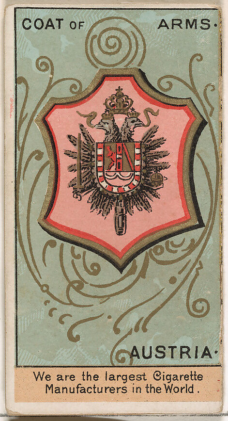 Trade cards from the "Rulers, Flags, and Coats of Arms" series (N126-2), issued in 1888 by W. Duke, Sons & Co. There are two types of cards from the series. The first type is made of thick stock and does not fold. This variation promotes Honest Long Cut tobacco. The second type, pictured here, is printed on thinner stock and is meant to be folded in three parts. This variation promotes Duke's Cigarettes, Cameo, and Turkish Cross-Cut brands.