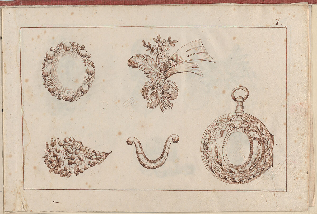 First page of a small album containing drawings with jewelry designs copied after the prints by L. van der Cruycen, "Nouveau Livre de Desseins..." (New Book of Designs...), published in Paris in 1770. The designs in this page are for a medallion, an aigrette, two brooches, and a case watch, all of them characteristic of the style in vogue during the reign of Louis XVI in France, displaying a serendipitous flavor, with asymmetrical forms, "rocaille" and stylized natural motifs, and heavily decorated with flowers, ribbons and tassels, thus representing the taste of the Rococo style, which was fashionable in France and Europe during the eighteenth century. The elaborately carved forms presented in the designs were particularly sought after during the third quarter of the eighteenth century, and were to be accomplished by skilled artisans who would work out the decorations by hand.