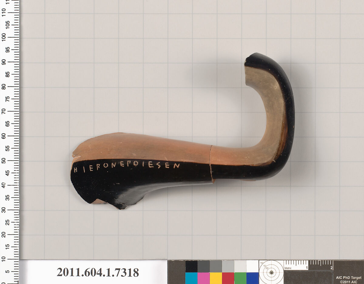Exterior, part of a kylix handle with an inscription, HIERON EPOIESEN