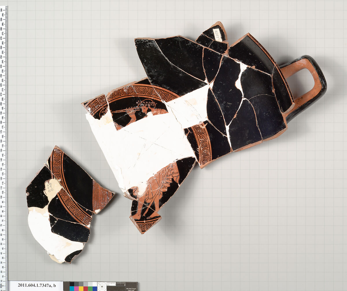 Interior, head and arms of a wreathed aulos player; wreathed, bearded man wearing a himation, with a staff; Exterior, (of larger fragment) drapery and foot of male to right; handle with handle patch preserved to rim; below, a circumscribed palmette and tendrils; draped male holding a lotus in his right hand, with a knobby stick underneath his bent left arm; lower body and feet of a draped male to right; Exterior of smaller fragment, feet of a figure to left; part of a circumscribed palmette; stick and lower drapery of a male to right