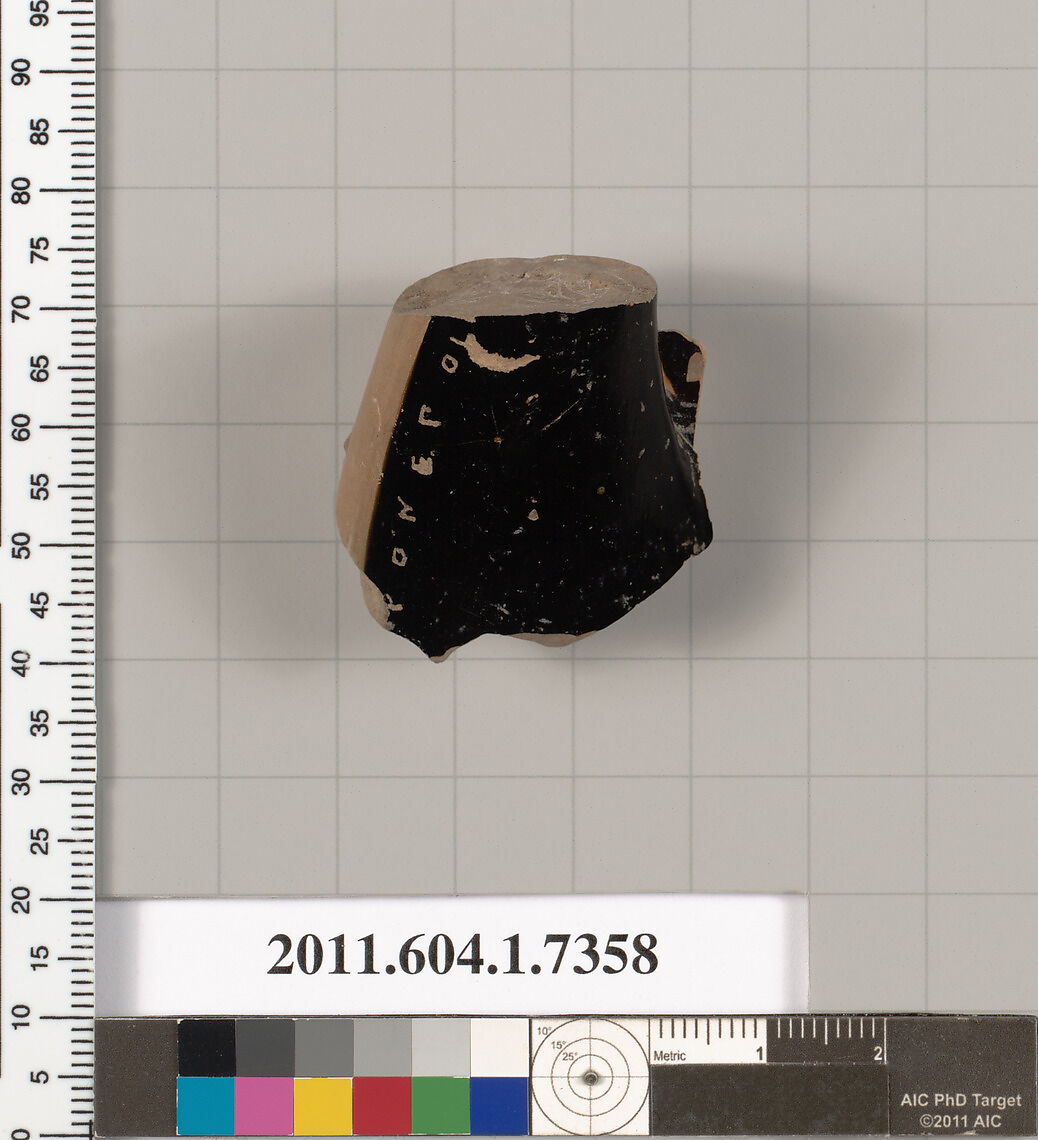 Handle root from right half of handle; inscribed on the black glaze, [HIE]RON EPOI[SEN]