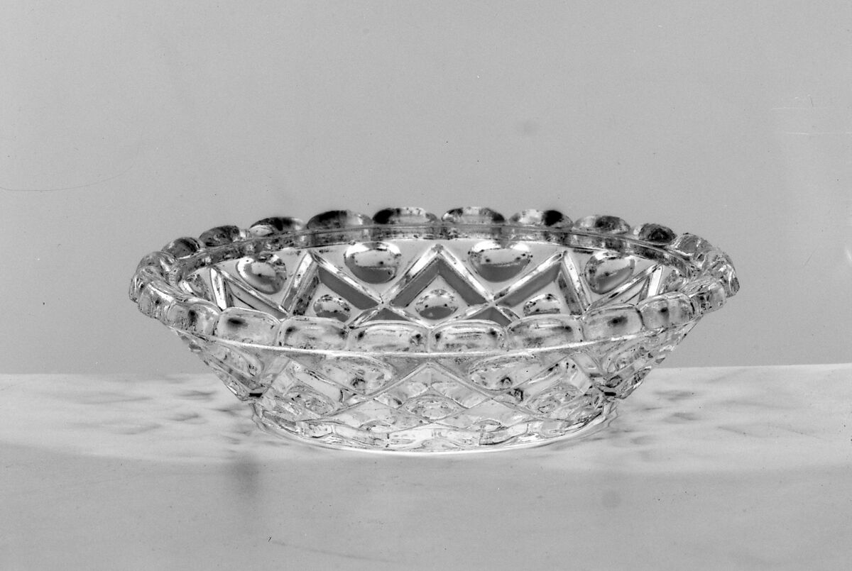 With the development of new formulas and techniques, glass-pressing technology had improved markedly by the late 1840s. By this time, pressed tablewares were being produced in large matching sets and innumerable forms. During the mid-1850s, colorless glass and simple geometric patterns dominated. Catering to the demand for moderately-priced dining wares, the glass industry in the United States expanded widely, and numerous factories supplied less expensive pressed glassware to the growing market. At the Exhibition of the Industry of All Nations at New York’s Crystal Palace in 1853, for example, the New England Glass Company exhibited 130 pieces of one design, "consisting of bowls, tumblers, champagnes, wines, and jelly glasses." This object belongs to one such service. Although the glass manufactory is not known, the glassware is very typical of the large services that were very popular with America’s middle class in the nineteenth century.