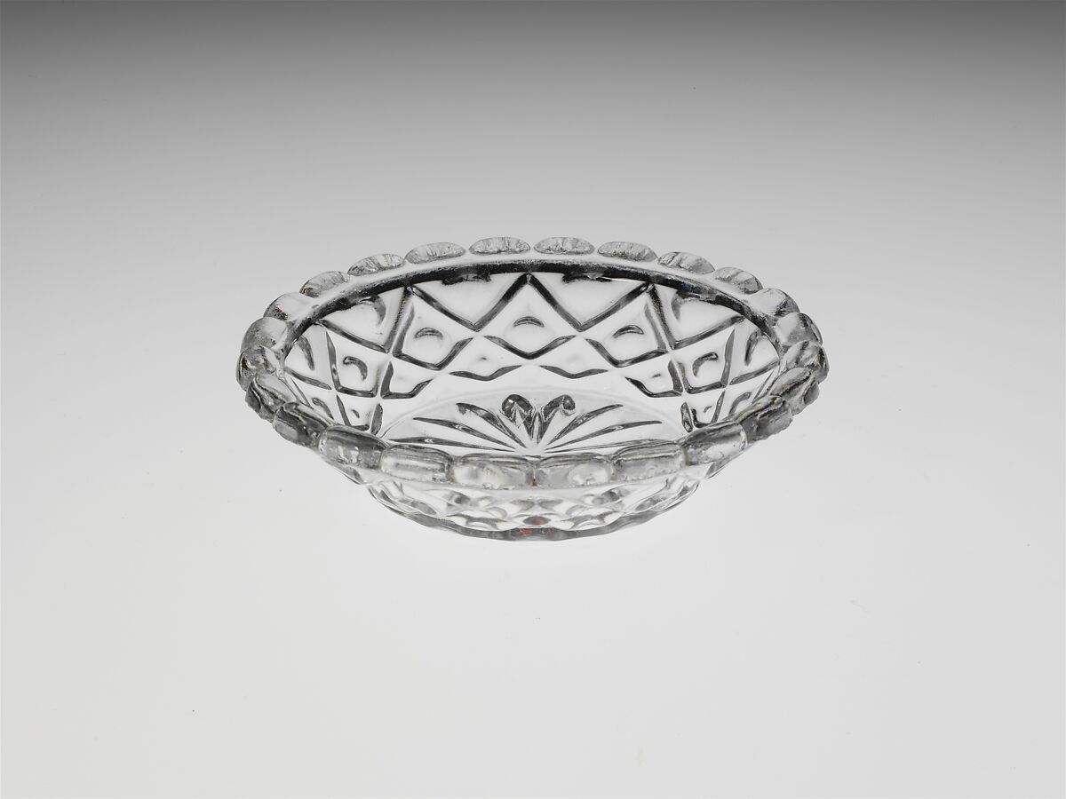 With the development of new formulas and techniques, glass-pressing technology had improved markedly by the late 1840s. By this time, pressed tablewares were being produced in large matching sets and innumerable forms. During the mid-1850s, colorless glass and simple geometric patterns dominated. Catering to the demand for moderately-priced dining wares, the glass industry in the United States expanded widely, and numerous factories supplied less expensive pressed glassware to the growing market. At the Exhibition of the Industry of All Nations at New York’s Crystal Palace in 1853, for example, the New England Glass Company exhibited 130 pieces of one design, "consisting of bowls, tumblers, champagnes, wines, and jelly glasses." This object belongs to one such service. Although the glass manufactory is not known, the glassware is very typical of the large services that were very popular with America’s middle class in the nineteenth century.