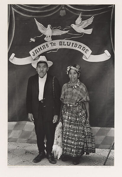 Between 1971 and 1979, Ann Parker traveled throughout rural Guatemala, working alongside the itinerant photographers who plied their trade at village fairs and religious festivals. These journeymen offered their clientele the rare opportunity to sit for a portrait, thus providing the images necessary for government identification cards, as well as personal mementos. For many of the subjects, these inexpensive postcard-sized (or smaller) photographs were the only pictures they would ever have made of themselves. Parker’s series, published in the 1982 book Los Ambulantes: The Itinerant Photographers of Guatemala, documents a photographic practice that existed since the nineteenth century, but had, by the 1970s, almost disappeared. Here, Parker reveals the vibrant, if rudimentary, trappings of makeshift studios, which featured boldly painted backdrops that often bore messages like “I’ll never forget you” (Jamas Te Olvidare.) The figures in this portrait do not smile or mug for its direct manner, Parker's photograph captures more than the practice of itinerant photographers, and conveys the quintessential magic of photography.