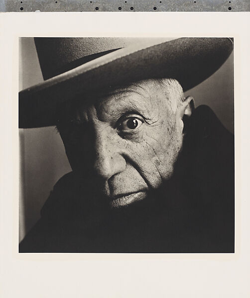 When Penn arrived at Picasso’s house in the south of France, the artist pretended not to be home. But after Penn’s assistant climbed over the locked gate, Picasso granted the photographer ten minutes. Covering his sweat-shirt with a Spanish cape, Picasso tried to playfully deflect him. Variants of this image show how Penn patiently worked the pose, allowing the artist his costume play while progressively boring in to isolate the riveting gaze of his left eye.