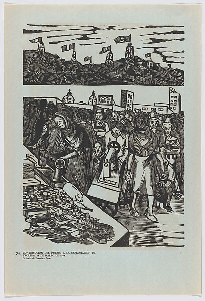 - Title: Plate 74: the contribution of the people when Lázaro Cárdenas announced that oil found in Mexico belonged to the country and not the foreign companies, from "Estampas de la Revolución Mexicana" (Prints of the Mexican Revolution)