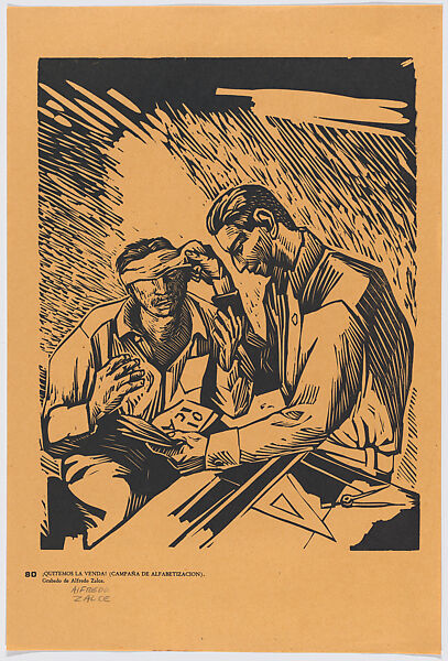 - Title: Plate 80: a young man removing a bandage from his eye, to learn to read (relating to the literacy campaign), from "Estampas de la Revolución Mexicana" (Prints of the Mexican Revolution)
