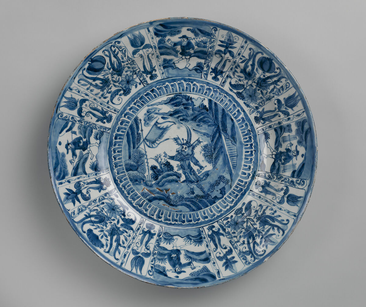The dramatic warrior with two axes depicted in the center of this plate illustrates the addition of figures based on popular plays and novels to the repertory of kraak ware, a type of ceramic that was often exported to Europe. This warrior, who cannot be precisely identified, holds axe in his lowered right hand, with a second one in his belt, and may be allusion to Li Gui (also known as the Black Whirlwind), one of the heroes of the classic Ming novel The Water Margin (Shui Hu Zhuan). The composite groupings of flowers on the panel, on the other hand, reflect the impact of contemporaneous Turkish Iznik wares on the evolution of kraak ware in the early seventeenth century while some of the single blossoms represent tulips, a flower that was first cultivated in Turkey, and eventually spread to Holland as part of the development of global trade, including Chinese porcelains, in the late sixteenth and seventeenth century.