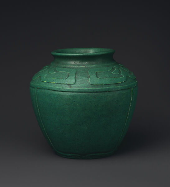 Frederick Walrath was among the first students at the newly-established ceramics program at Alfred University, where he studied with Charles Ferguson Binns from 1901 to 1904. He taught for a couple of years at the University of Chicago’s School of Education, but he returned to his home in Rochester, New York, to look after his father, and soon set up his own pottery there. He also joined the faculty at the Mechanics Institute in Rochester (late the Rochester Institute of Technology), where he taught modeling and pottery. He developed some highly successful colored and textured matte glazes, and even experimented with crystalline glazes. He also carved vases for a short time, as seen in this example with a Native American inspired design. Walrath’s promising career, however, was cut short by an early death after operating his independent pottery for only about a decade and a half.