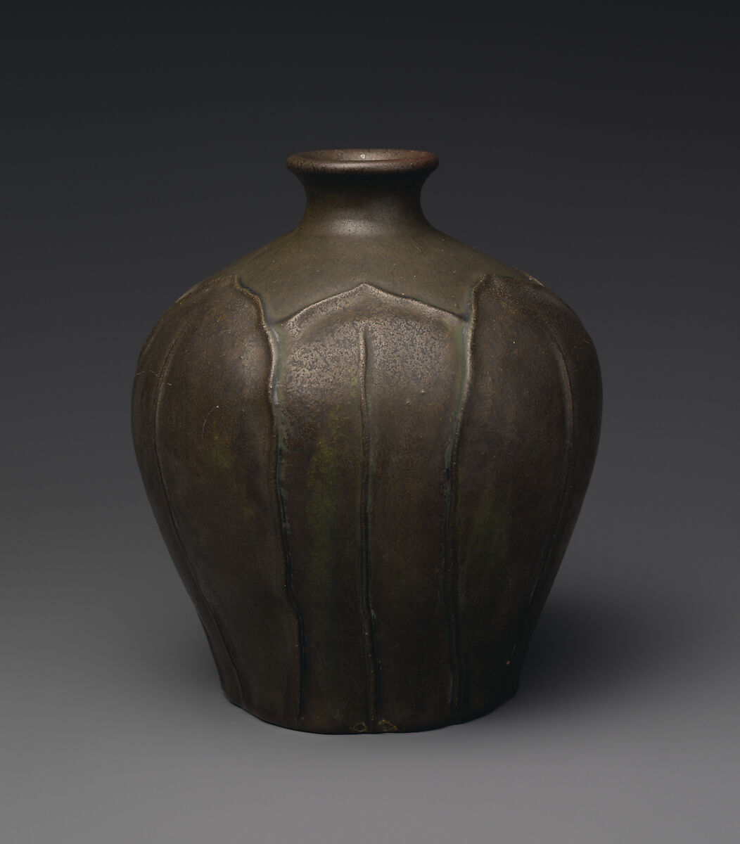 William J. Walley was one of Grueby’s many followers in the Northeast. Working in his small pottery in West Sterling, Massachusetts, and inspired by Grueby’s leaf-based designs, Walley turned from historicizing shapes to vessels with richly modeled plant forms that are variations on Grueby’s inventions. Whereas the Boston pottery relied on decorators to apply thin ropes of clay to delineate the leaves, in many instances Walley created designs where the leaves are modeled with greater relief.