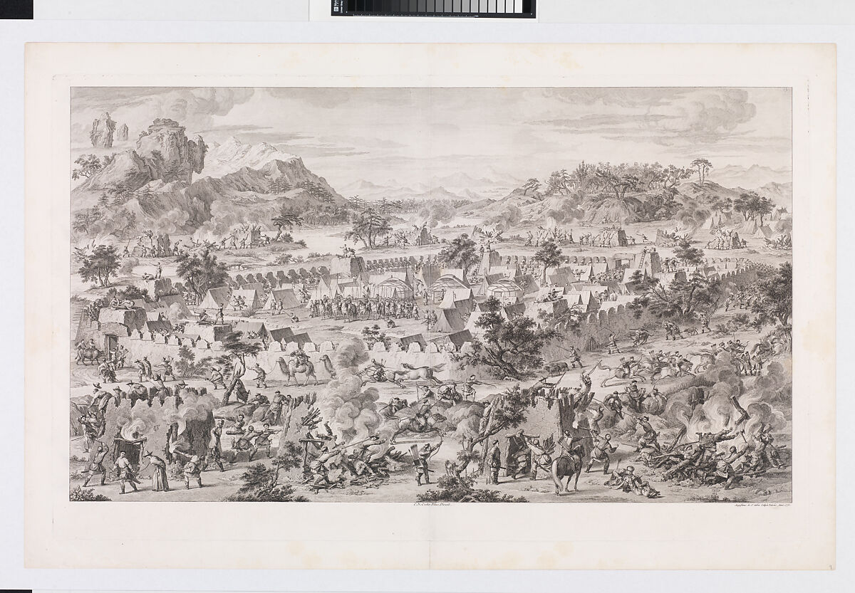 Part of a set of sixteen, "The Battle of Tonguzluq" was commissioned by the Qianlong Emperor in 1765 to commemorate Manchu victories (1755-59) over the Eleuths, the Dzungars, and other Central Asian peoples in the present-day region of Xinjiang. Made under the direction of Charles-Nicolas Cochin (1715-1790), the prints, which follow reduced-scale copies of paintings by Jesuit artists working in Beijing, were etched and engraved in France from 1767 to 1774 by the finest printmakers at the court of Louis XV. The Chinese merchants of Canton (present-day Guangzhou) paid for the copper plates and two hundred sets of prints to be delivered to China, with only a few sets retained in Paris.