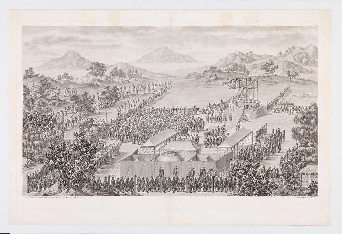Part of a set of sixteen, "The Emperor Greeting The Triumphant Troops Outside of the Capital" was commissioned by the Qianlong Emperor in 1765 to commemorate Manchu victories (1755-59) over the Eleuths, the Dzungars, and other Central Asian peoples in the present-day region of Xinjiang. Made under the direction of Charles-Nicolas Cochin (1715-1790), the prints, which follow reduced-scale copies of paintings by Jesuit artists working in Beijing, were etched and engraved in France from 1767 to 1774 by the finest printmakers at the court of Louis XV. The Chinese merchants of Canton (present-day Guangzhou) paid for the copper plates and two hundred sets of prints to be delivered to China, with only a few sets retained in Paris.