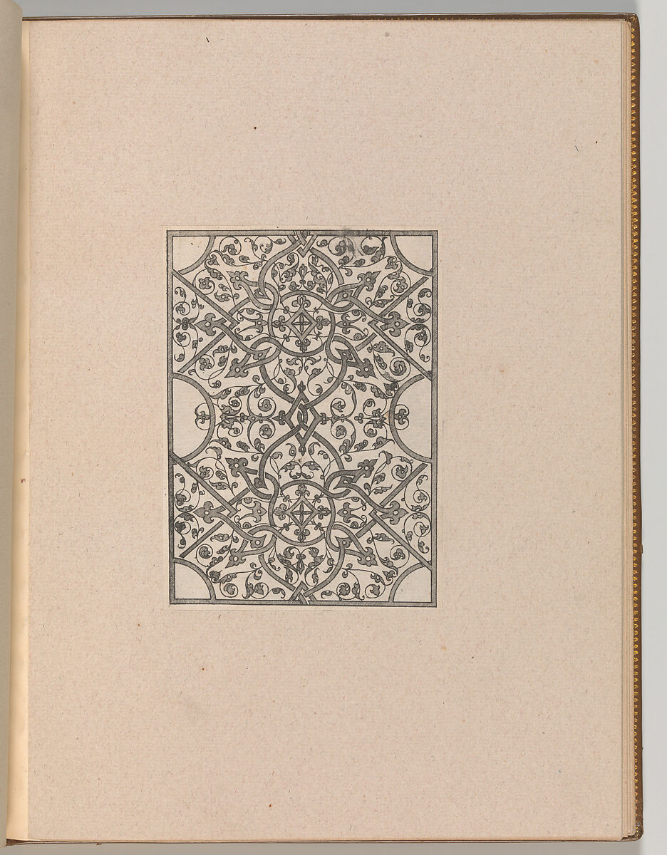 Modern album containing 19 etchings with moresque designs after an original series by the French artist Jacques Androuet Du Cerceau. The series was first published by Du Cerceau around 1545, and is also known to have been published by Martinus Petrus in Antwerp in 1563, who added a title page to his edition. Despite the apparent popularity of the series, it is now very rare. Only one complete set is known to exist, and was sold at the sale of Hippolyte Destailleur in 1895.The present whereabouts of this set are unknown. The prints in the present album may have been created as a facsimile series during the nineteenth century to accommodate collectors who desired to assemble a comprehensive collection of prints by Du Cerceau. The copies differ from the originals in certain details, especially in the hatchings, which have been applied in reverse and appear slightly mechanical. All prints have been mounted onto the pages of the album, but a window has been cut into the paper to leave the versos exposed.