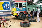 Man Changing Truck Tyres at a Petrol Pump, the Poster Advocates Family Planning, South of Trivandrum, Kerala