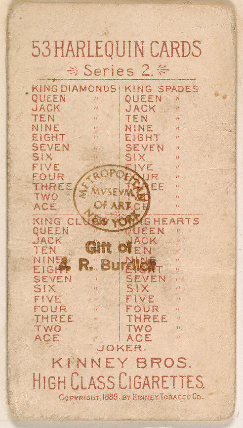 Playing cards issued as trade cards from the "Harlequin Cards, 2nd Series" (N220), issued in 1889 to promote Kinney Tobacco Company. Card versos are not visible as they are affixed to the original album page. This card verso is included as an example of the series verso.