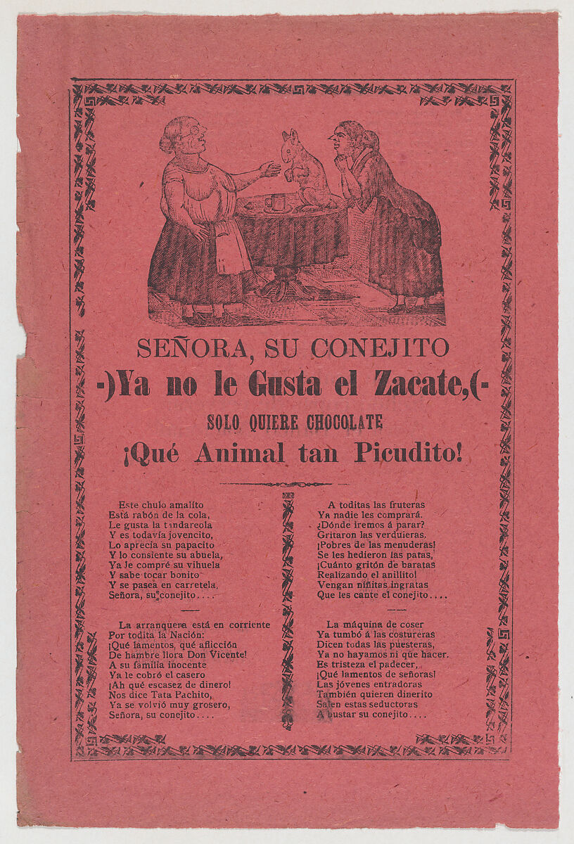 - Title: Broadsheet relating to the rabbit that does not like hay but only chocolate, a corrido (ballad) in the bottom section