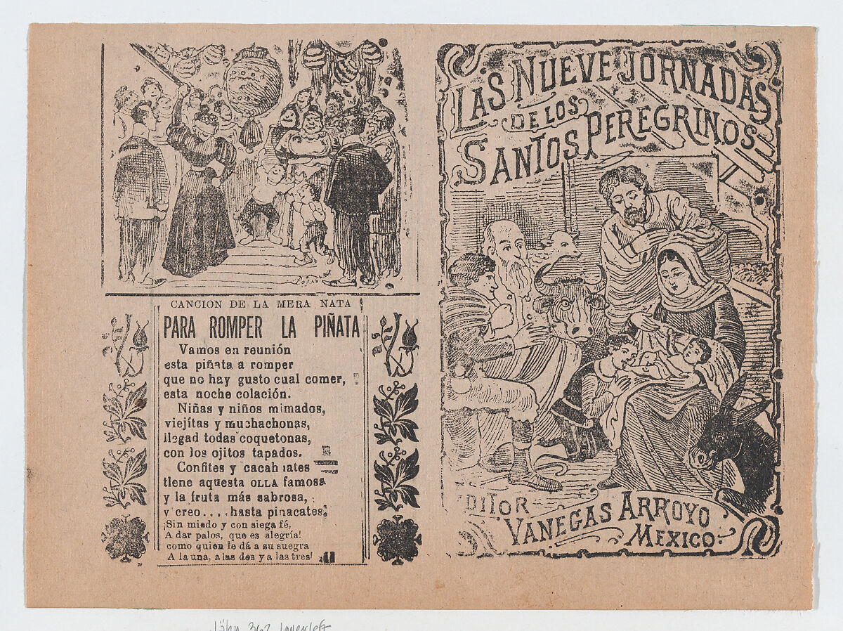 - Title: Two advertisments printed on the same sheet for materials published by Vanegas Arroyo, the one at left has verses to accompany breaking a piñata and at right, concerning religious pilgrims with an image of the Nativity