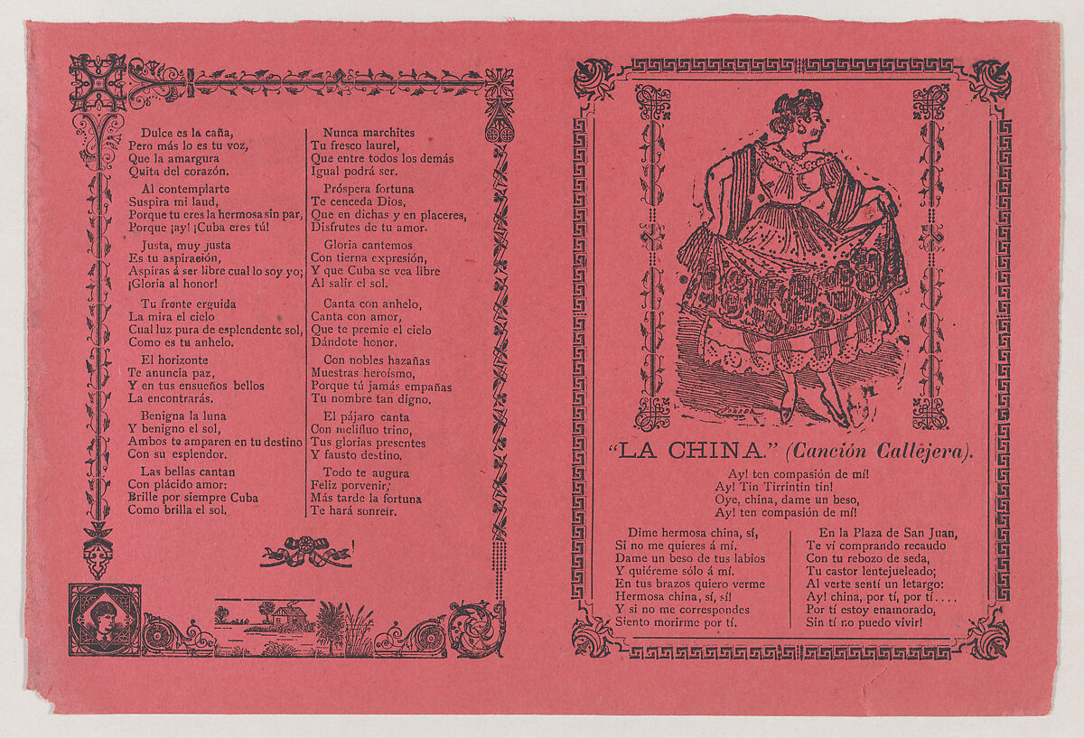 A broadsheet with a popular song 'La China' on the recto, on the verso the dance of 'Cuba Libre'
