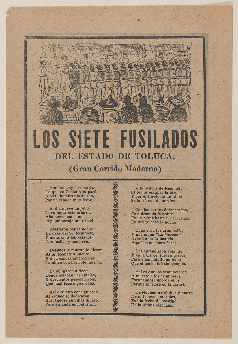 - Title: Broadsheet relating to seven men executed by a firing squad on account of their murder on July 9 of the entire household of Sr Remmett in Toluca, a corrido in the bottom section