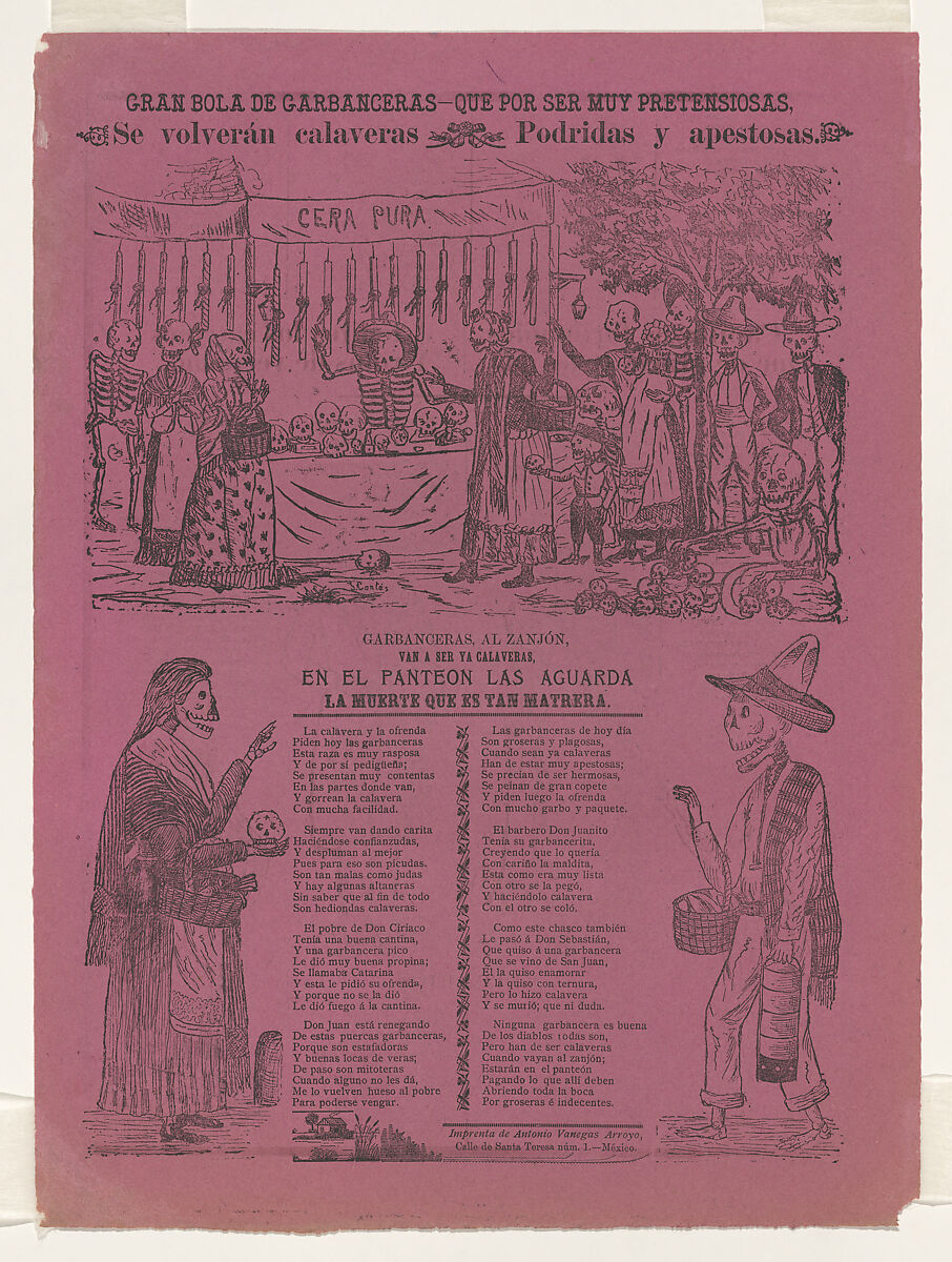 The term "garbancera" from the title was slang for an Indigenous person who denied their heritage and tried to look European—as have the two standing figures here. Written in a machismo tone, the text describes bad things that happen to men when they meet women, an idea represented by the image of a woman offering a skull to the man across from her. The text reminds the reader that death is always watching. Nothing is known of the artist except that he worked in the Vanegas Arroyo workshop around the same time as Posada.