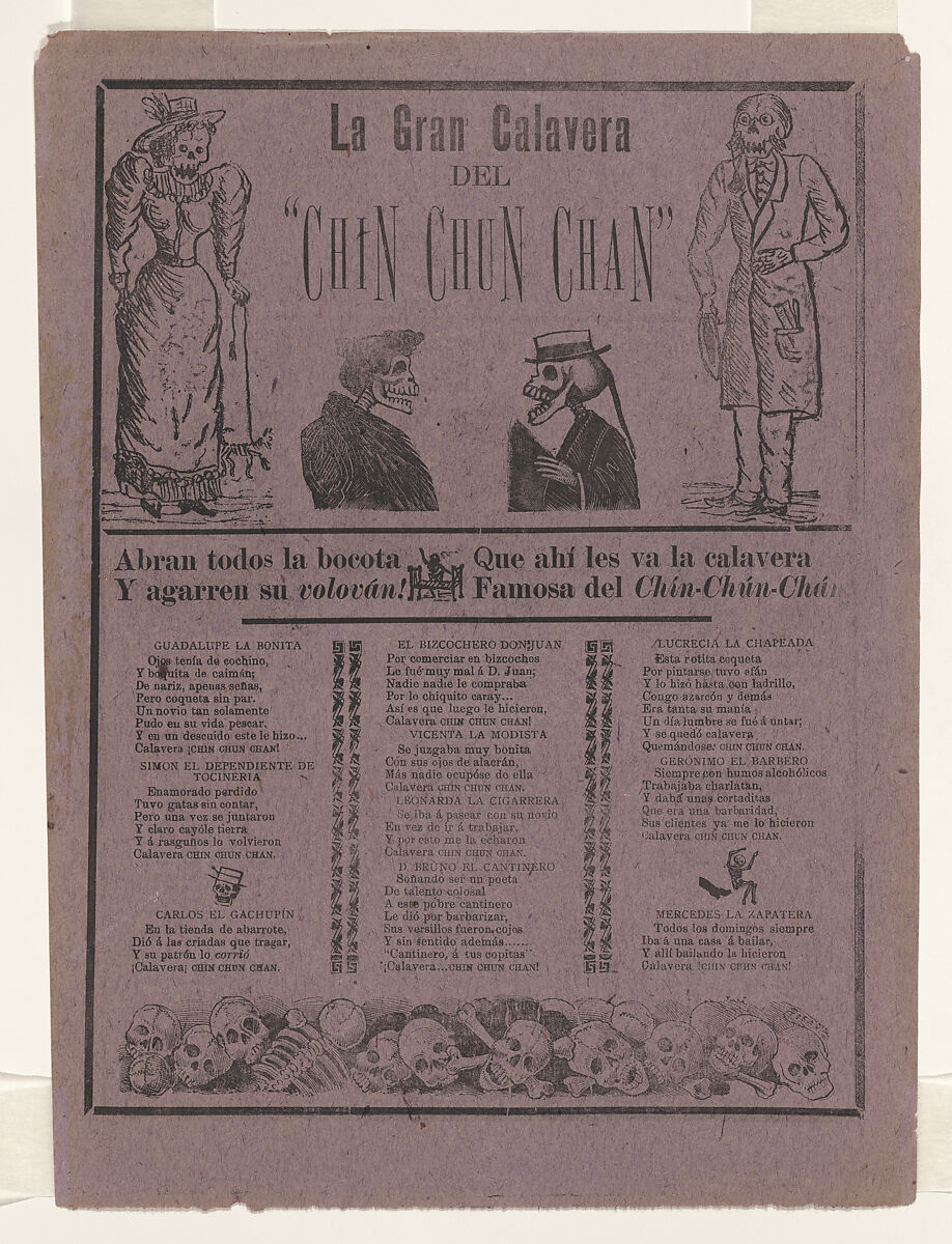 The musical comedy (zarzuela) Chin-Chun-Chan: Chinese conflict in one act and three parts opened at Mexico City’s Teatro Principal on April 9, 1904. It conveyed anti-Chinese sentiments that emerged after President Porfirio Díaz allowed Chinese workers to enter Mexico through an 1899 treaty. Capitalizing on the play’s popularity, Vanegas Arroyo published this broadsheet describing the misfortunes of fictional working-class Mexicans. Blocks were often reused in his workshop; the skeletons on this double-sided sheet were created by three artists at different times.
