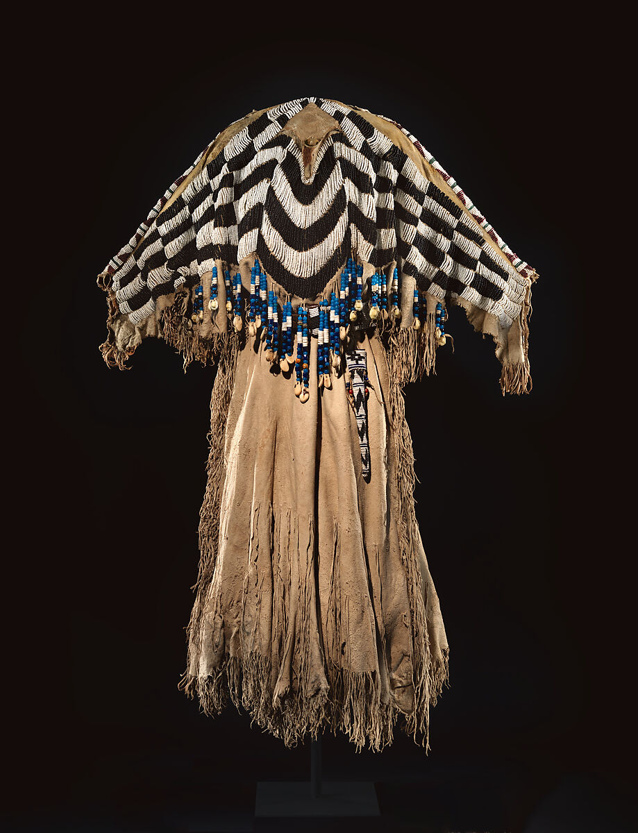 - Medium: Dress: tanned leather, glass beads, shell, bone, elk teeth, and brass thimbles