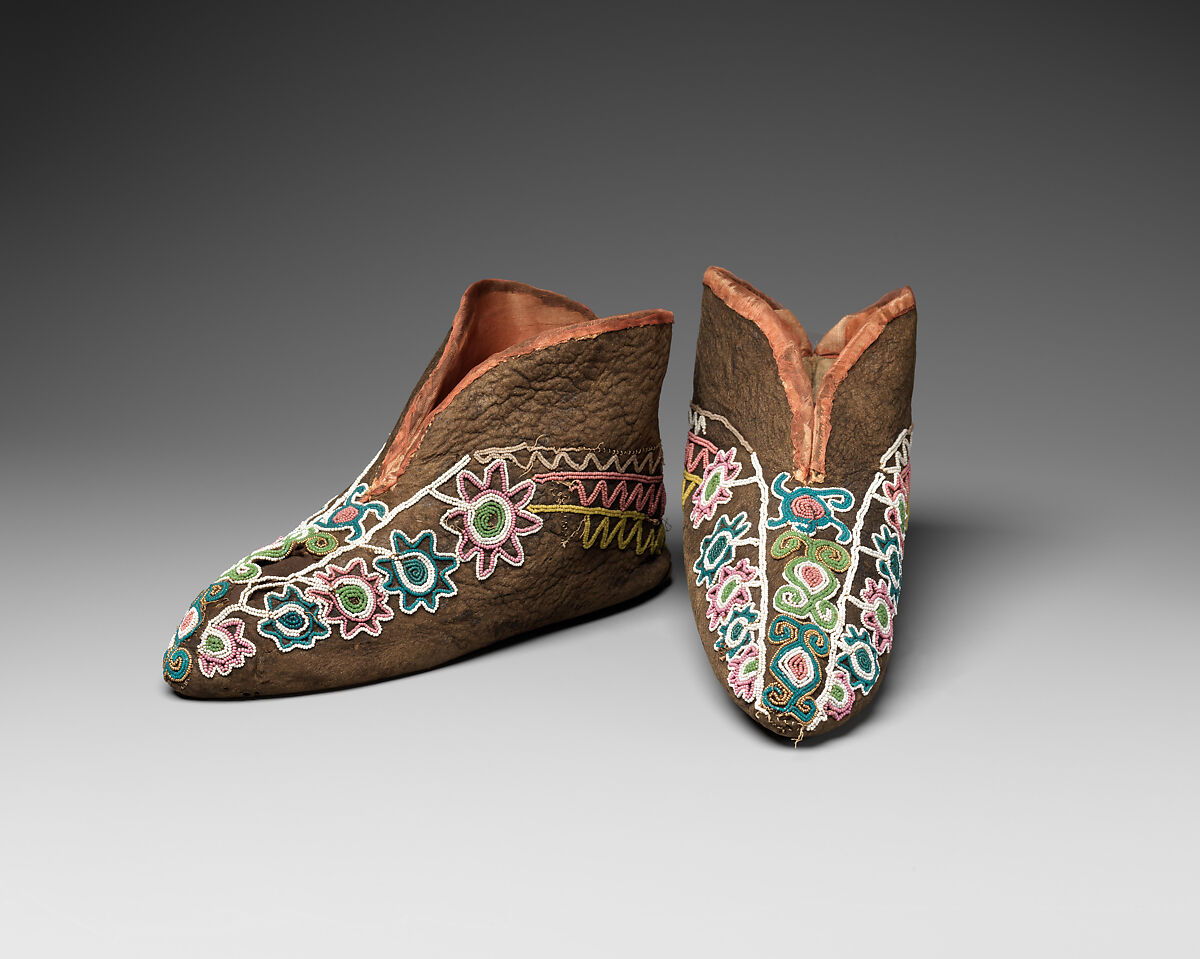 Women constructed each delicate yet functional center-seam moccasin from a single piece of dyed hide. This pair of moccasins, likely worn on special occasions, features elaborate floral and zigzag patterns. They are embroidered with tiny trade beads strung on a cotton thread with a stiffened tip and then secured to the hide with a needle and thread. The golden beads on the toes are metal, a valuable trade good, and the silk lining allowed the wearer to reveal a glint of luxury fabric at the ankle.