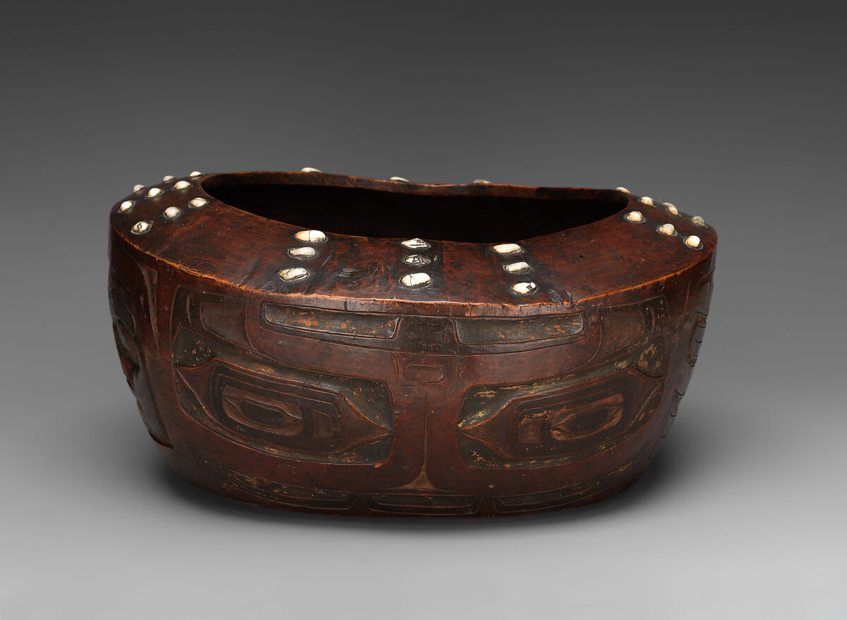 During potlatch feasts across the Northwest Coast, food is served in a variety of carved wooden bowls. Guests receive bowls sized according to their position in the community—the higher the rank, the larger the bowl. Artists imbue serving dishes with energy through graphic elements, including abstract humans, animals, and supernatural beings. The master carver of this deep container inlaid the incurving rim with four sets of nine white opercula—the removable coverings that secure a marine mollusk’s shell—which contrast with the dark wood. This bowl is a rare example of an early contact-period style of ornamentation, not yet influenced by trade with European expeditionary forces.