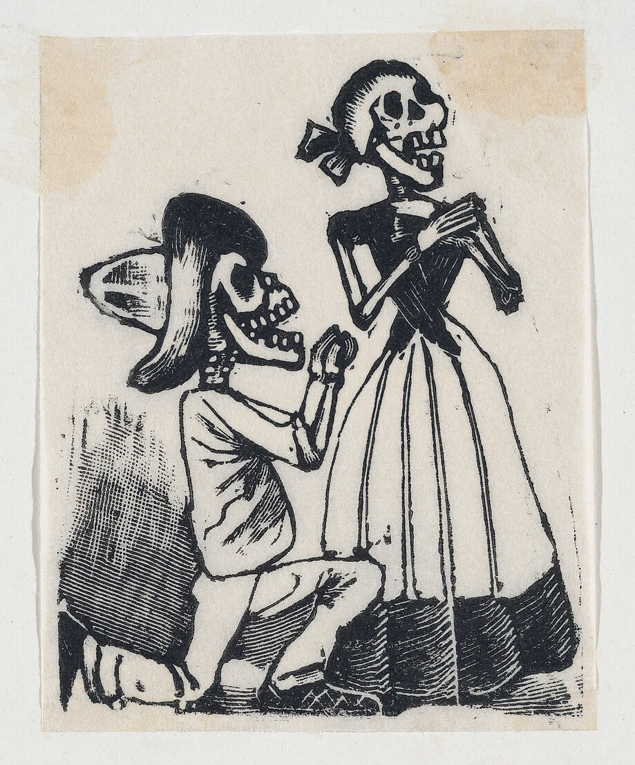 A male skeleton on his knees before a female skeleton (vignette for the feast of the dead)