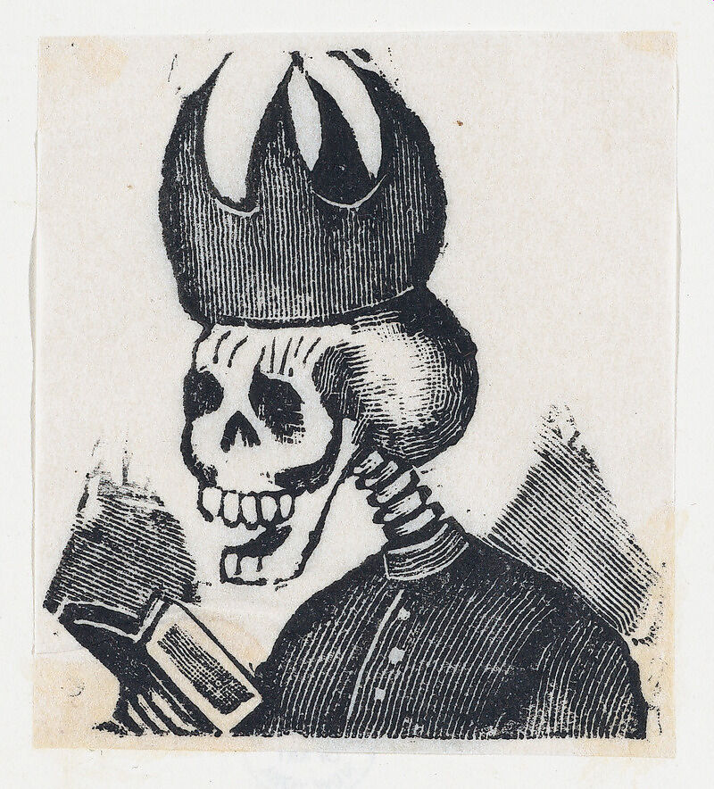 - Title: A skeleton wearing a bishop's mitre reading a book (vignette for the feast of the dead)