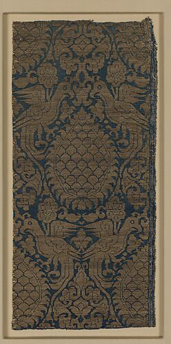 Although this textile has been identified as Seljuq, the very rounded cursive script of its inscription relates most closely to Il-Khanid tile inscriptions from the second half of the 13th century. Moreover, the use of roundels, while attested in Seljuq textiles, was equally popular under the Mongol Il-Khans. The depiction of the birds and palmettes is somewhat more simplified and stylized than those found on Seljuq textiles. This textile fragment, most likely from a robe, is decorated with a repeating pattern of a pair of addorsed regardant birds surrounded by an inscription band containing four iterations of the phrase "glory and dominion" in Arabic. The birds appear to be falcons, a symbol of power in the medieval eastern Islamic world. Following their conquests in Central Asia, Iran, and Iraq, the Mongol Il-Khans became very wealthy and developed a taste for silk garments that range from the most opulent and expensive cloths of gold to plain silk woven in various complex techniques.