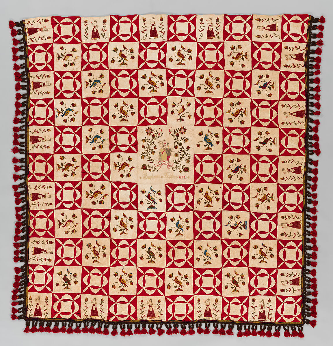 This quilt is one of four known quilts and several quilted pillowcovers made by the Schleifer/Kichlein women in the 1830s. It demonstrates their unique family style of alternating red and white pieced blocks with embroidered blocks. In this case, red and white blocks in the "Reel" or "Orange Peel" pattern alternate with blocks of white embroidered cotton. The central block of the quilt is embroidered with a fashionably dressed couple and a small boy, and an inscription that reads "Euphemia Kichlein 1832." The quilt was completed in 1832 Euphemia Kichlein, likely with the help of her mother Christina Schleifer Kichlein as Euphemia was only 14 years old.