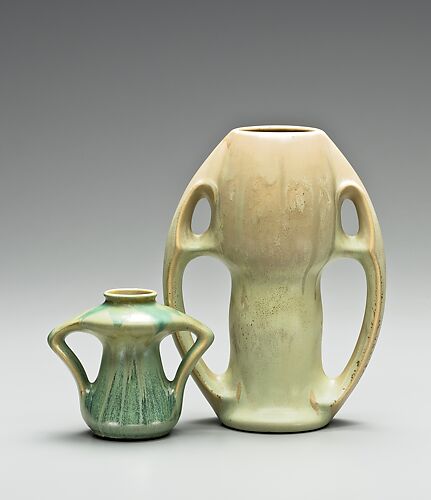 The Arts and Crafts Movement saw great popularity among artists and makes for Native American crafts. New Jersey’s Clifton Pottery responded to that taste by initiating a line of Indian ware with shapes derived from archaeological forms and decoration, such as the ornamentation seen on this teapot. The pottery utilized a nearly identical form with a slightly different handle and completely different finial on a teapot with a matte green glaze, as seen in an example in the collection of the Newark Museum.