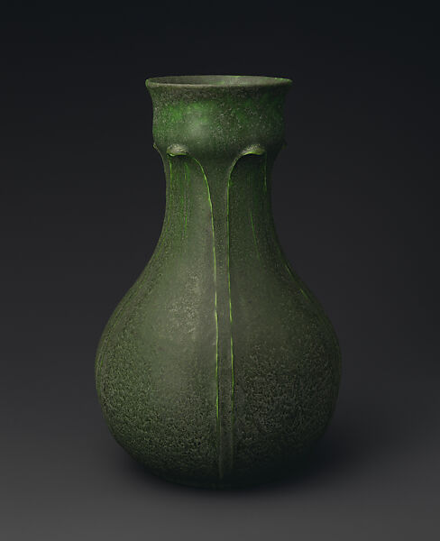 William H. Grueby founded his art pottery in Boston, Massachusetts, after first operating a successful tile works. His exposure to contemporary French ceramics at the 1893 World’s Columbian Exposition in Chicago marked a turning point in his career. He admired the novel matte glazes of the French studio potters, and was especially attracted to the relief designs he saw on the stoneware of August Delaherche. He developed his distinctive glazes, notably his dense, opaque matte green glaze, often with irregular veining that critics compared to the skin of a watermelon. Most of his vessels feature relatively simple modeled decoration of stylized broad leaves. Many of his designers were conceived by Boston architects, George Prentiss Kendrick and Addison Le Boutillier. In customary practice, the throwing, glazing, and firing was done by men, and the decoration was executed by a small staff of mainly women. They would roll out thin ropes of clay and apply them to the vase’s surface, further modeling, tooling, and carving them to finish the designs.