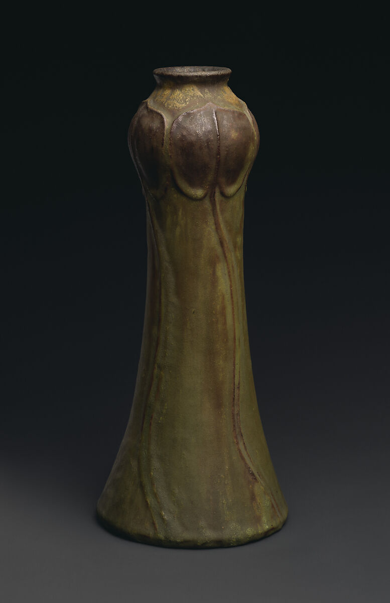 William J. Walley was one of Grueby’s many followers in the Northeast. Working in his small pottery in West Sterling, Massachusetts, and inspired by Grueby’s leaf-based designs, Walley turned from historicizing shapes to vessels with richly modeled plant forms that are variations on Grueby’s inventions. Whereas the Boston pottery relied on decorators to apply thin ropes of clay to delineate the leaves, in many instances Walley created designs where the leaves are modeled with greater relief.