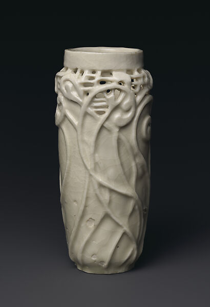 Louise McLaughlin was a pioneering figure in the history of American ceramics. Like many women of her time, she began her artistic career as a china painter. One of her earliest innovations was her discover of the barbotine technique in the late 1870s and early 1880s. One of her most challenging endeavors was her decision to work in artistic porcelain, a medium that had traditionally been confined to a large factory setting. McLaughlin began her experiments in porcelain in 1898 in a studio in her home, which she called “Losanti;” although a small enterprise, she hired assistants to slip-cast models she created, and then she carved or excised designs into the vases, glazed them, and had them fired in a kiln in her back yard in Cincinnati. McLaughlin and her colleagues in Cincinnati were especially influenced by the work of contemporary Scandinavian potteries, notably the Royal Copenhagen Porcelain Manufactory and Bing and Grøndahl firm in Denmark and the Rørstrand in Sweden. This vase in particular channels the work of Bing and Grøndahl with its pierced neck of scrolling stems.