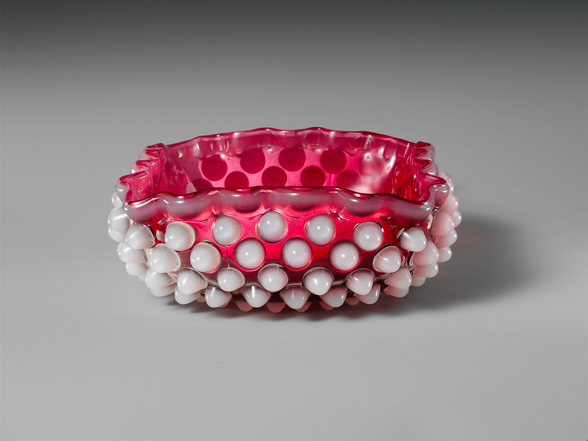 - Medium: Pressed cranberry with opaque white glass