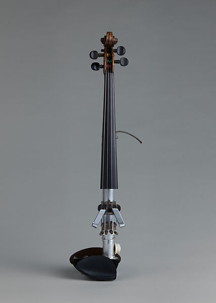 The Rickenbacker company was one of the first to experiment with electric instruments. This unusual violin is made of an aluminum tube with a maple violin scroll and an ebony fingerboard mounted to the tube. The serial number 21 is stamped on the heel of the violin. The large horseshoe pickups are located at the bridge and each string has its own termination point (as opposed to acoustic violins that end in a tailpiece). A celluloid plastic knob controls the volume. A bakelite block located at the bottom of the instrument holds the electronics and a cord plgus into this block to attach to an amplifier. The chin rest also attaches to this block. A single piece of metal attaches to the tube to suggest the upper right bout of the traditional violin, helping the violinist find positions and "feel" the normal size of the instrument.