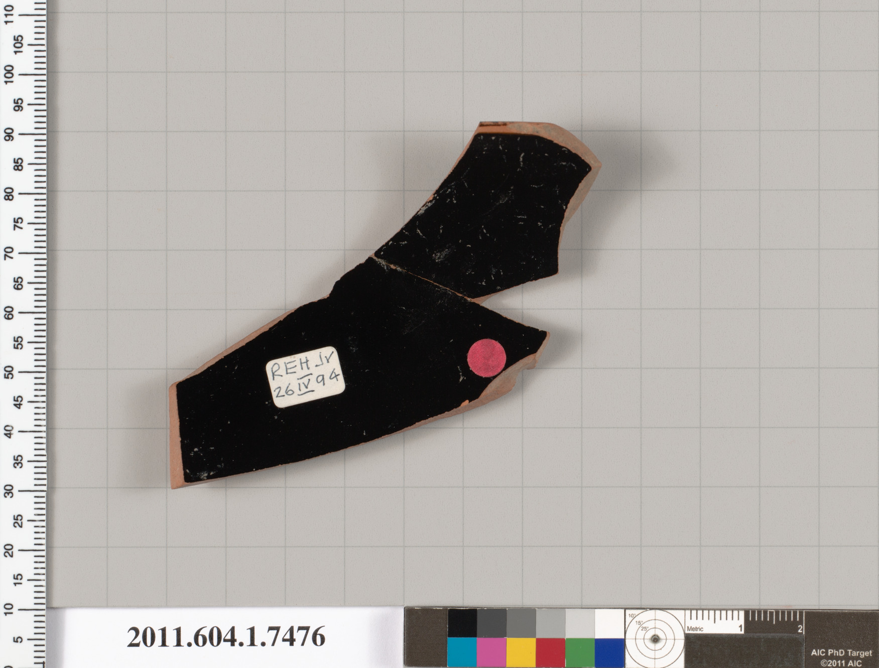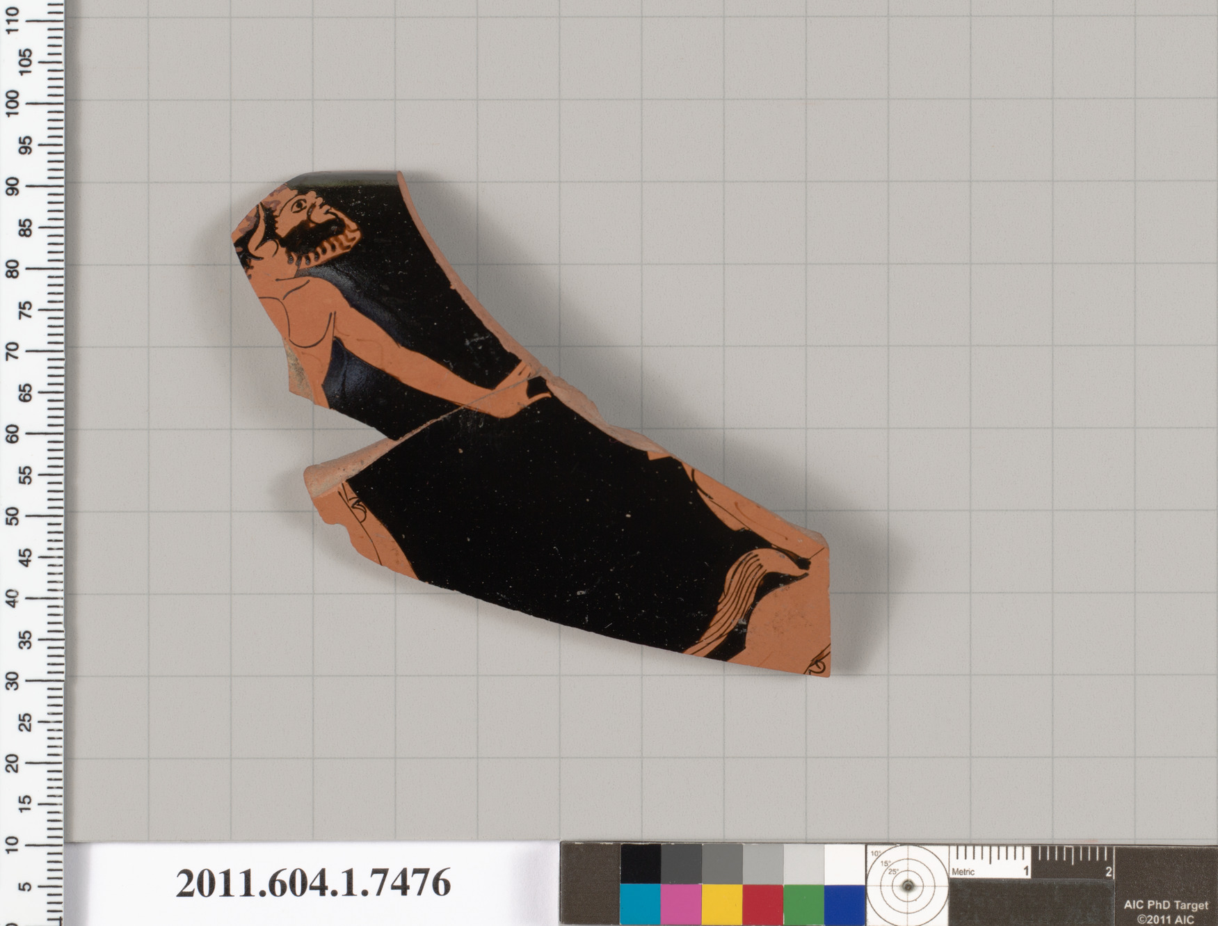 Exterior, head, neck, right shoulder, extended left arm, part of upper torso, in three-quarter view, genitals, and thighs of wreathed satyr to right; tail, right buttock, thigh, and genitals of satyr to right
