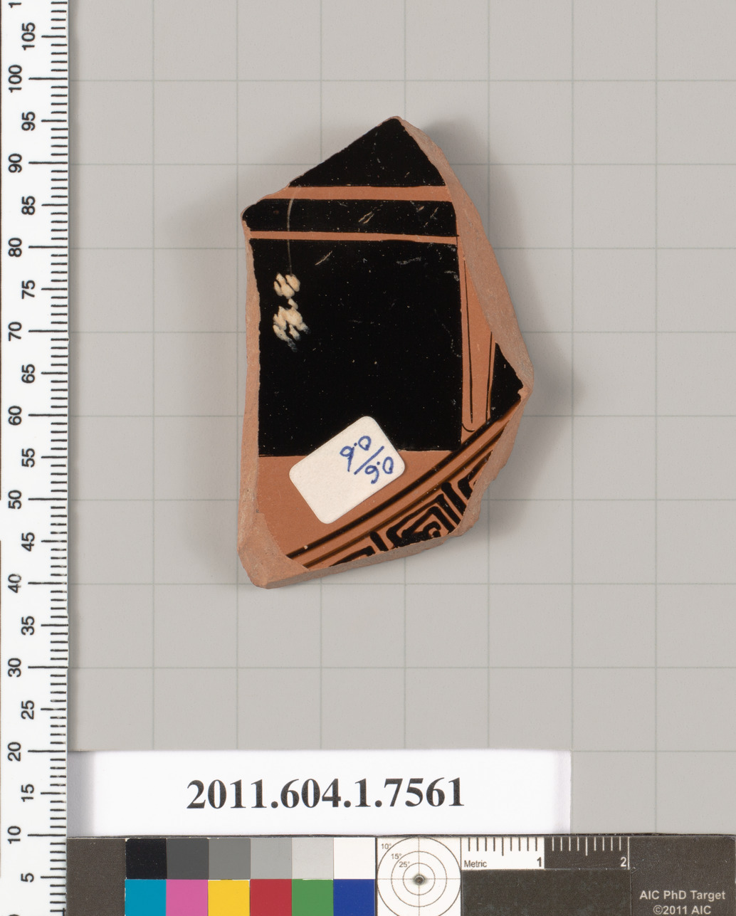 Interior, on exergue, table with korymboi; Exterior, left calf and foot; at the right, korymboi?