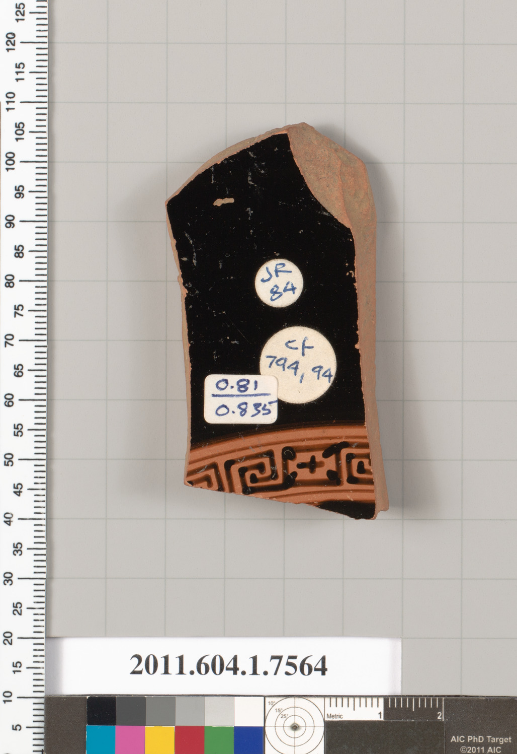 Interior, meander; Exterior, lower drapery, leg, and foot of a male with a stick; part of a circumscribed palmette