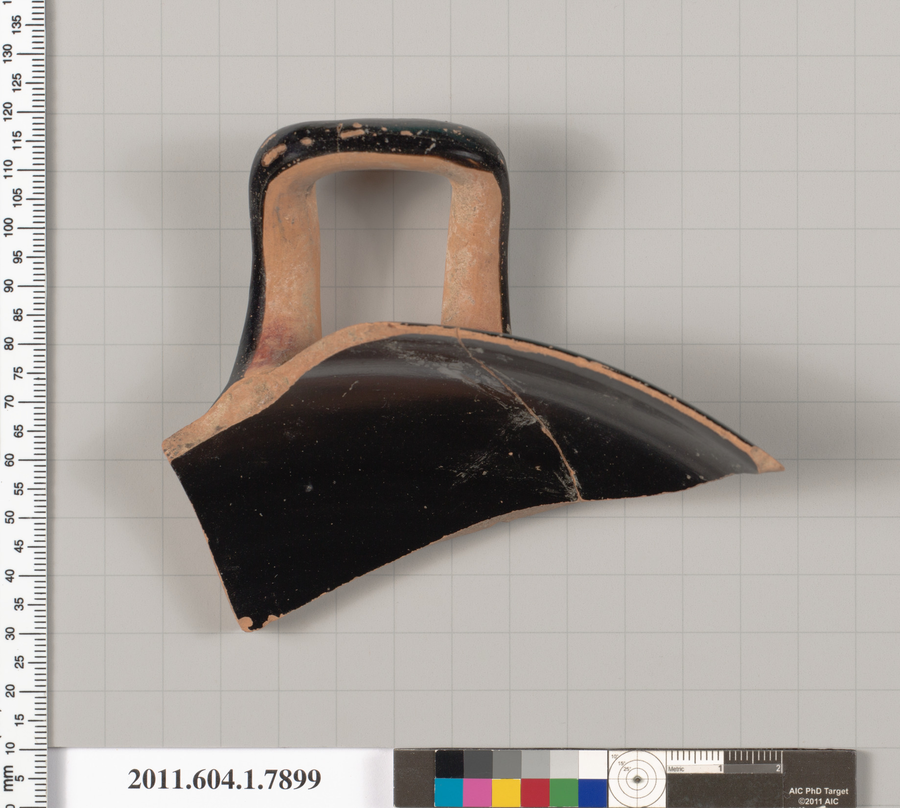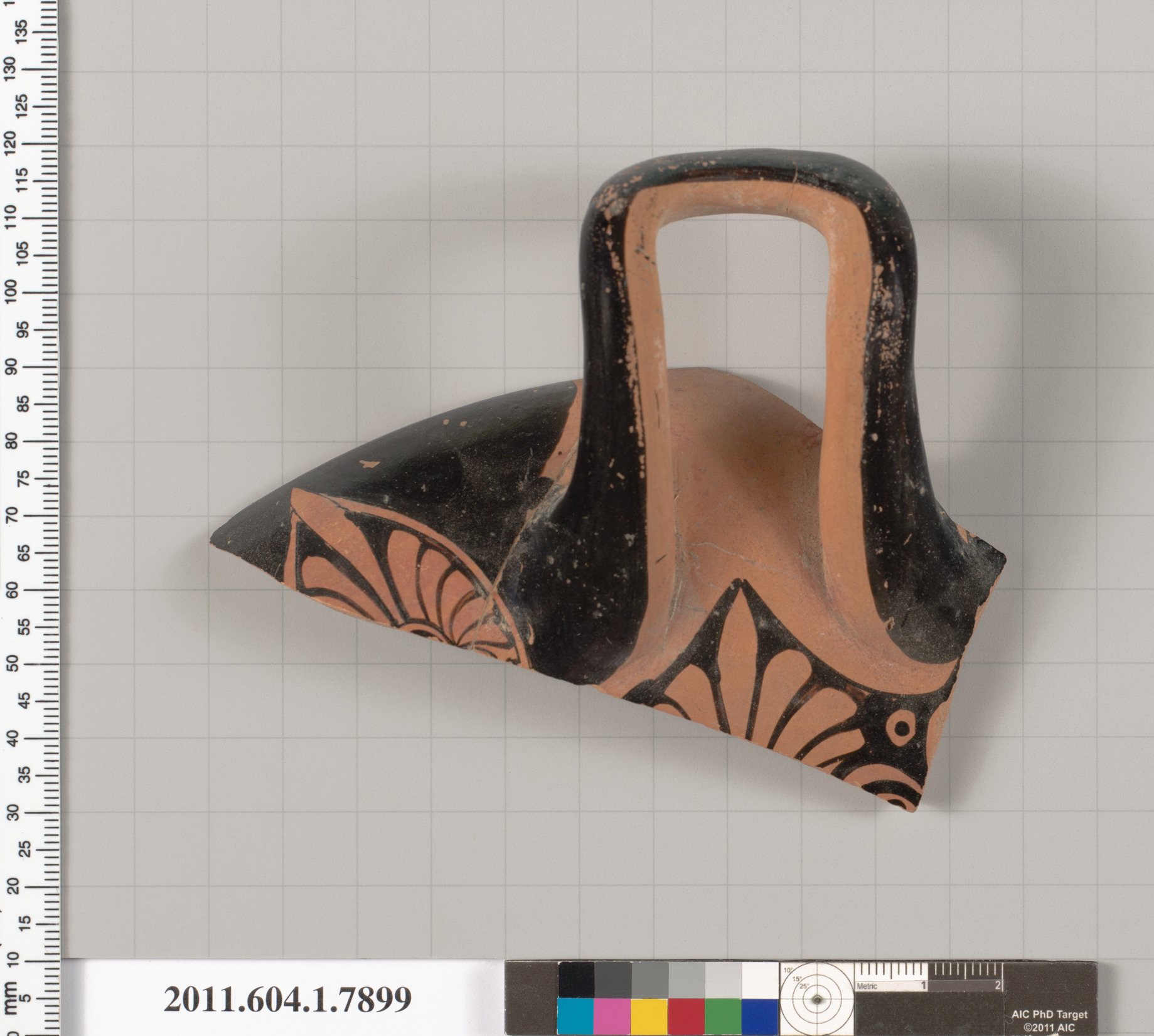 Exterior, part of a circumscribed palmette, with an elongated central frond; complete handle with handle patch preserved to rim; below, part of a palmette